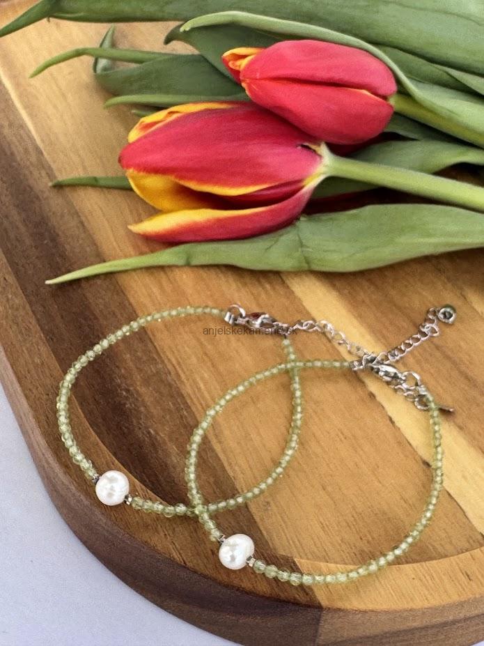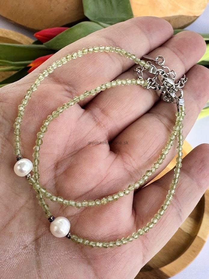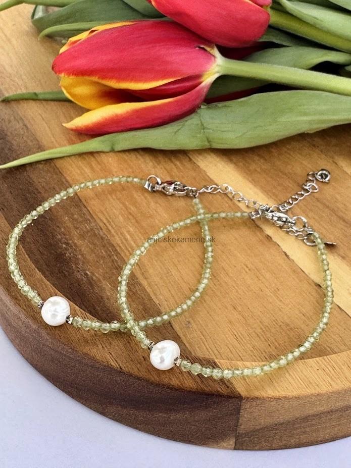 Fazetovaný náramok z minerálu Olivín (Peridot) vo veľkosti 2 mm je doplnený riečnou perlou.