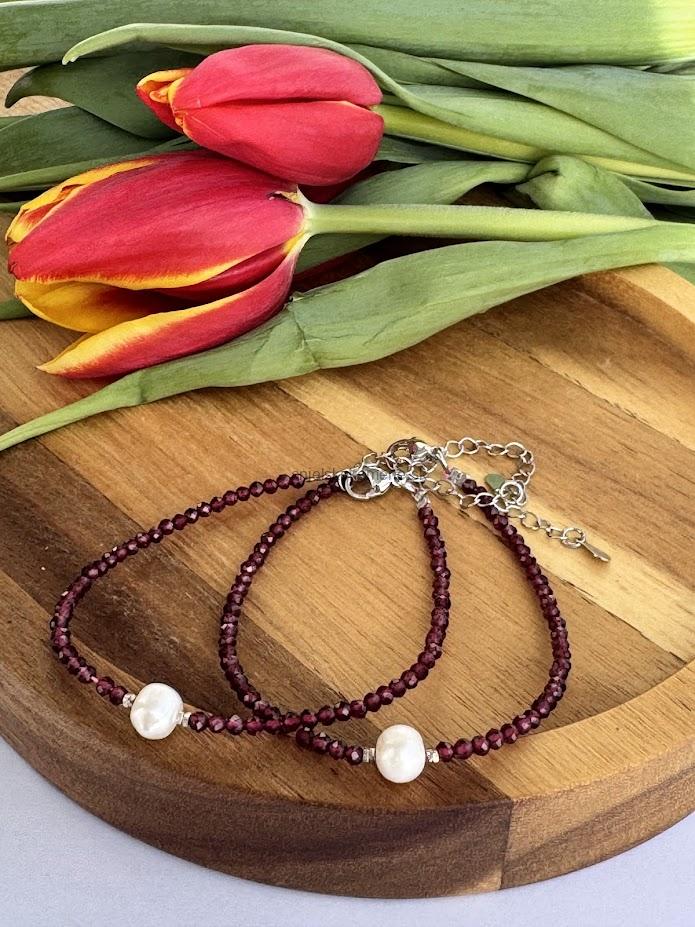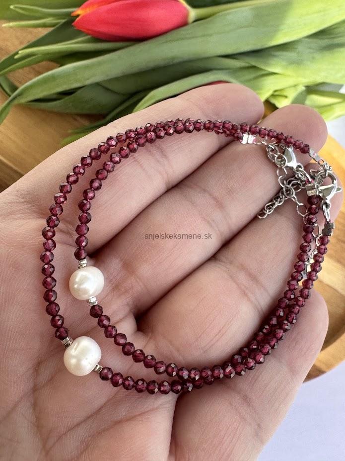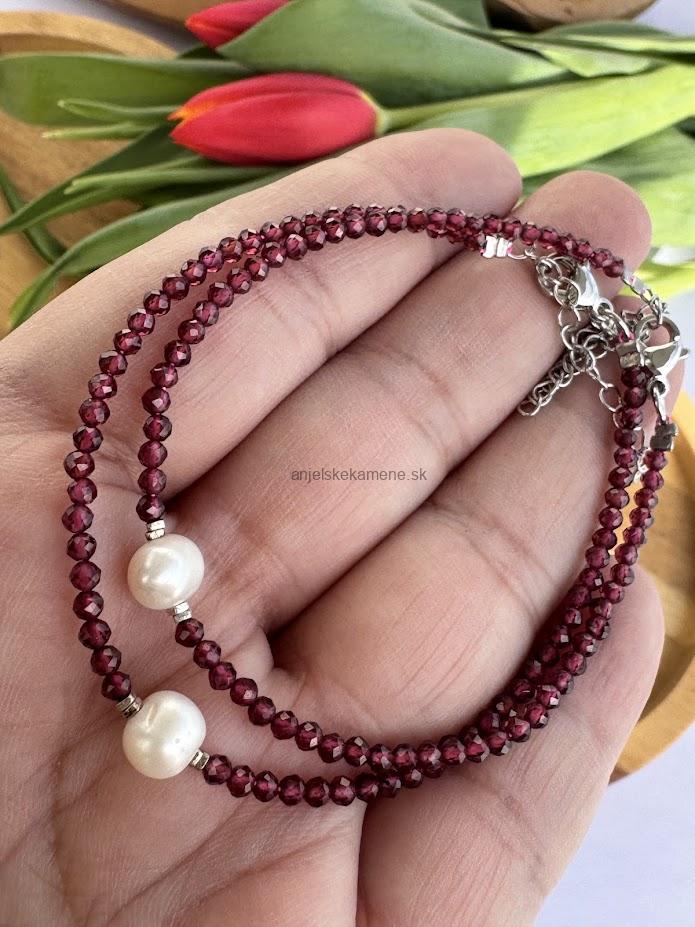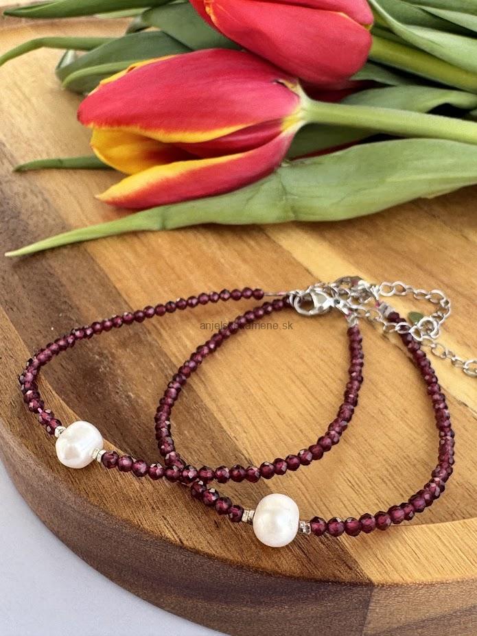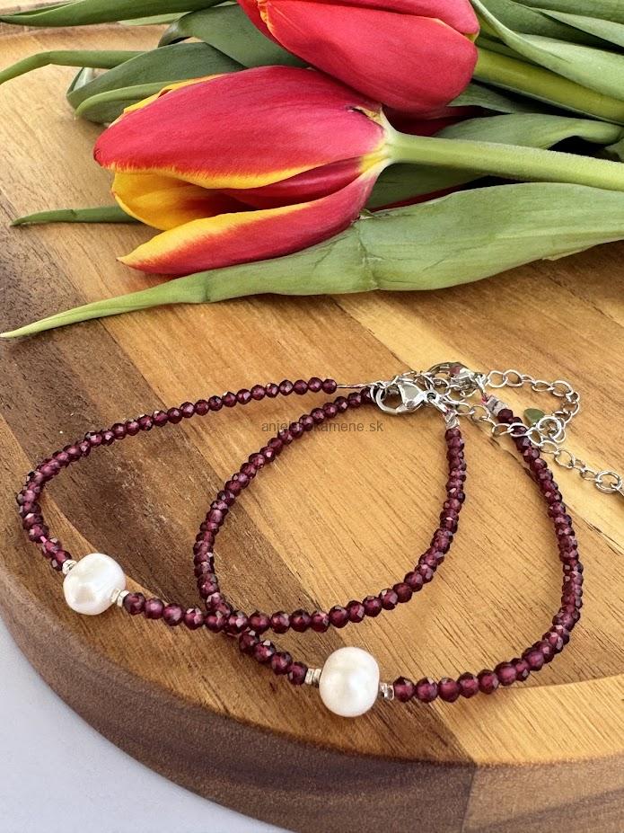 Náramok z fazetovaného granátu 2 mm je doplnený riečnou perlou.