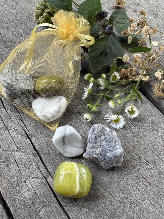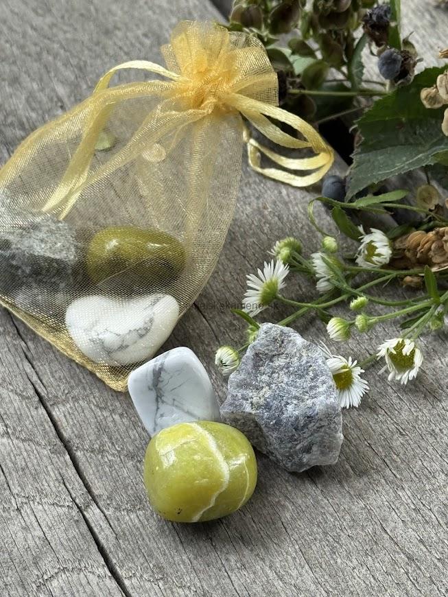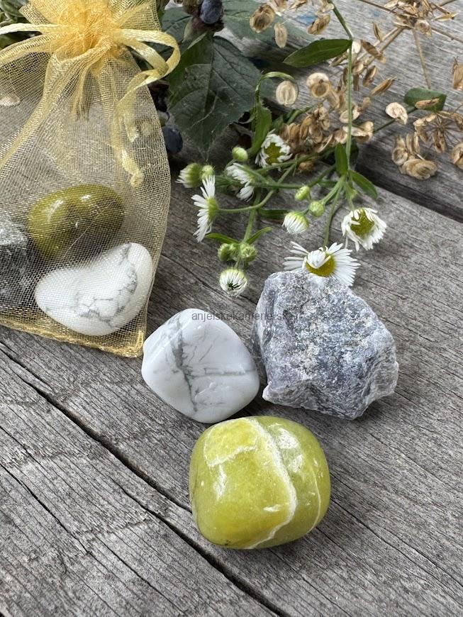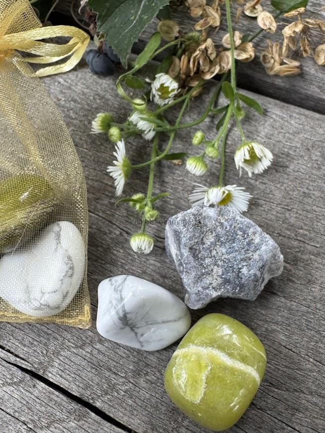 Sada obsahuje 3 ks kryštálov v organzovom vrecku (1 ks surový iolit, 1 ks magnezit a 1 ks nefrit - jadeit) a kartička. Súčasťou balenia nie je krabička na fotografii.