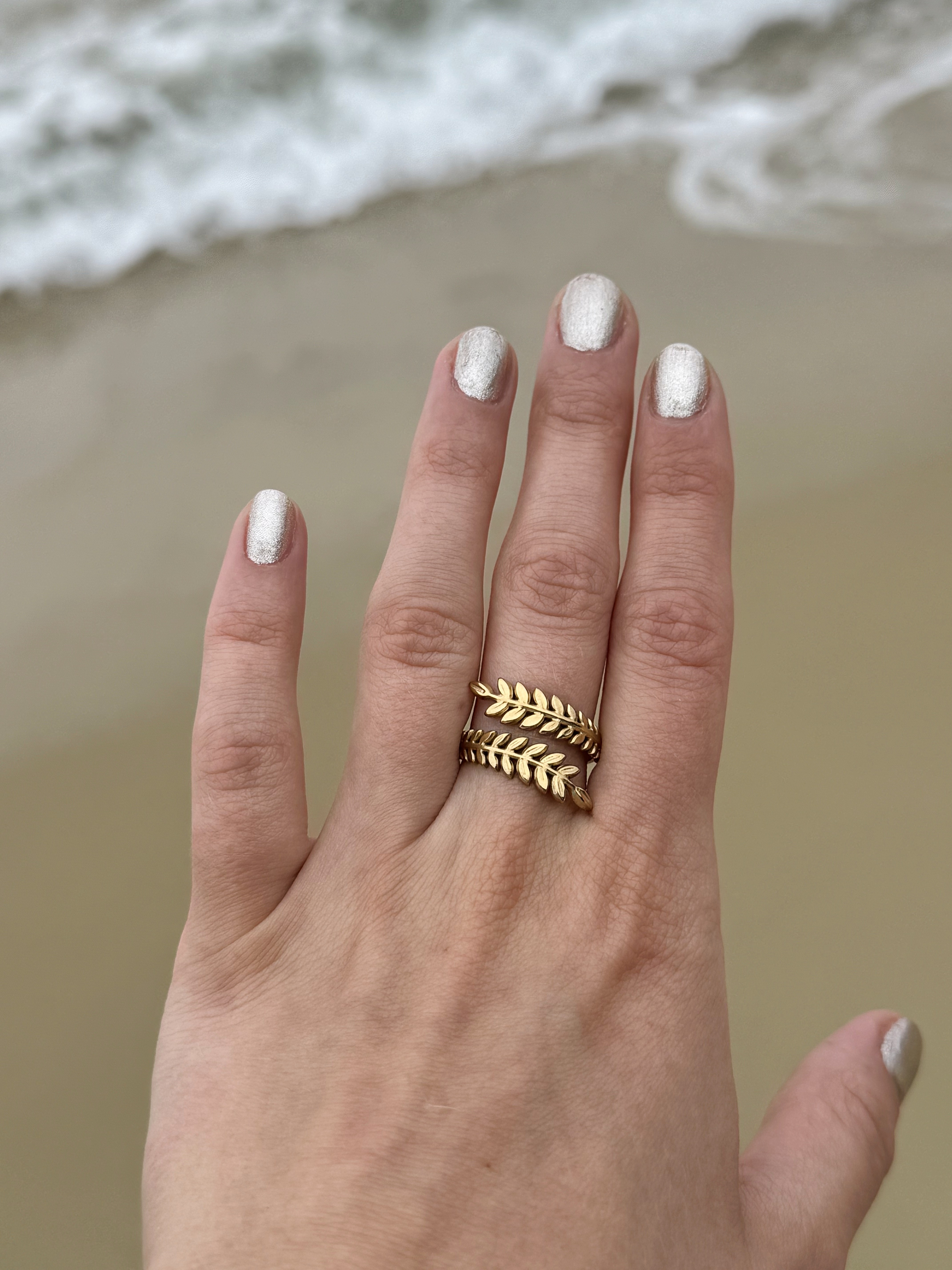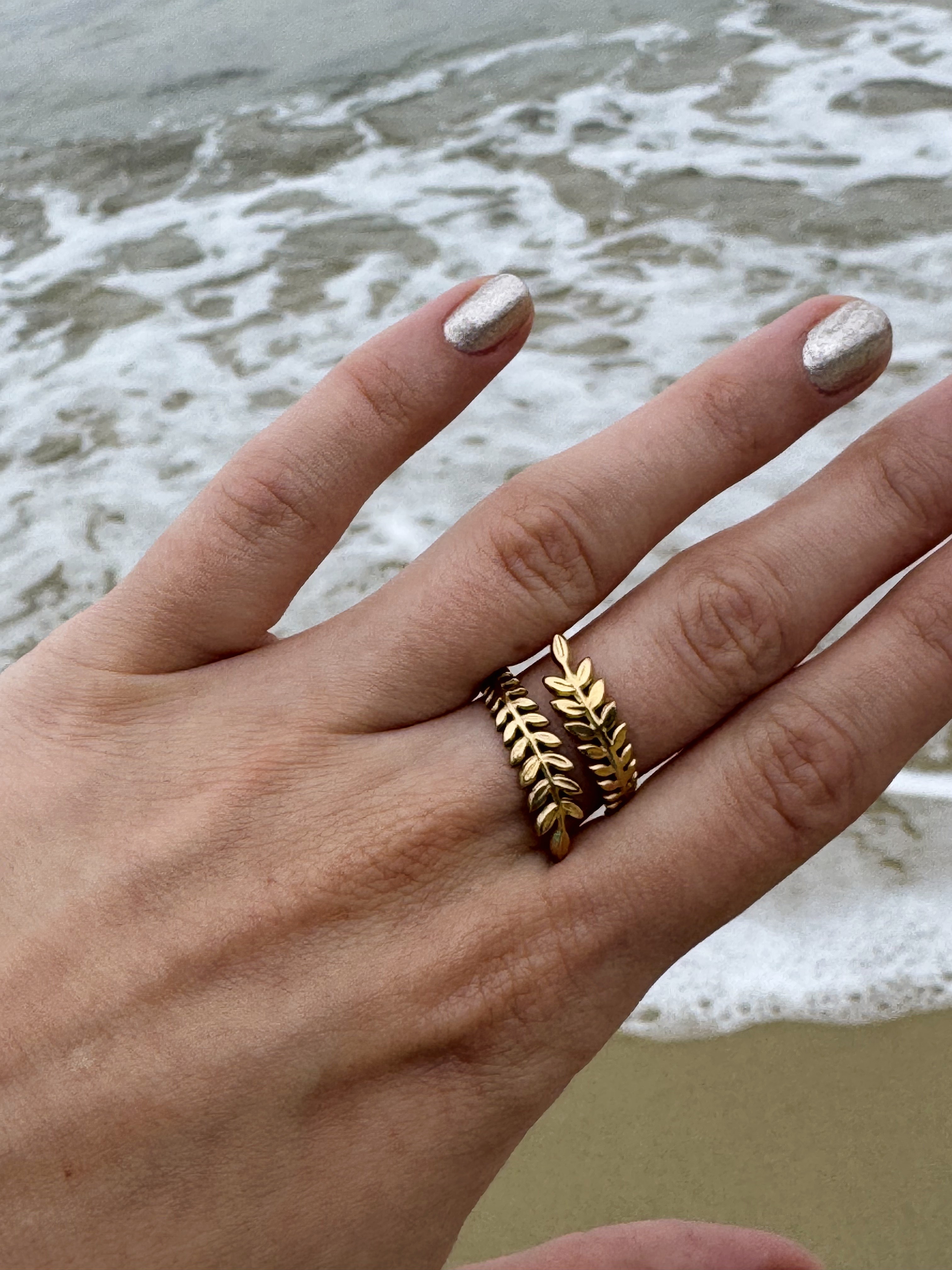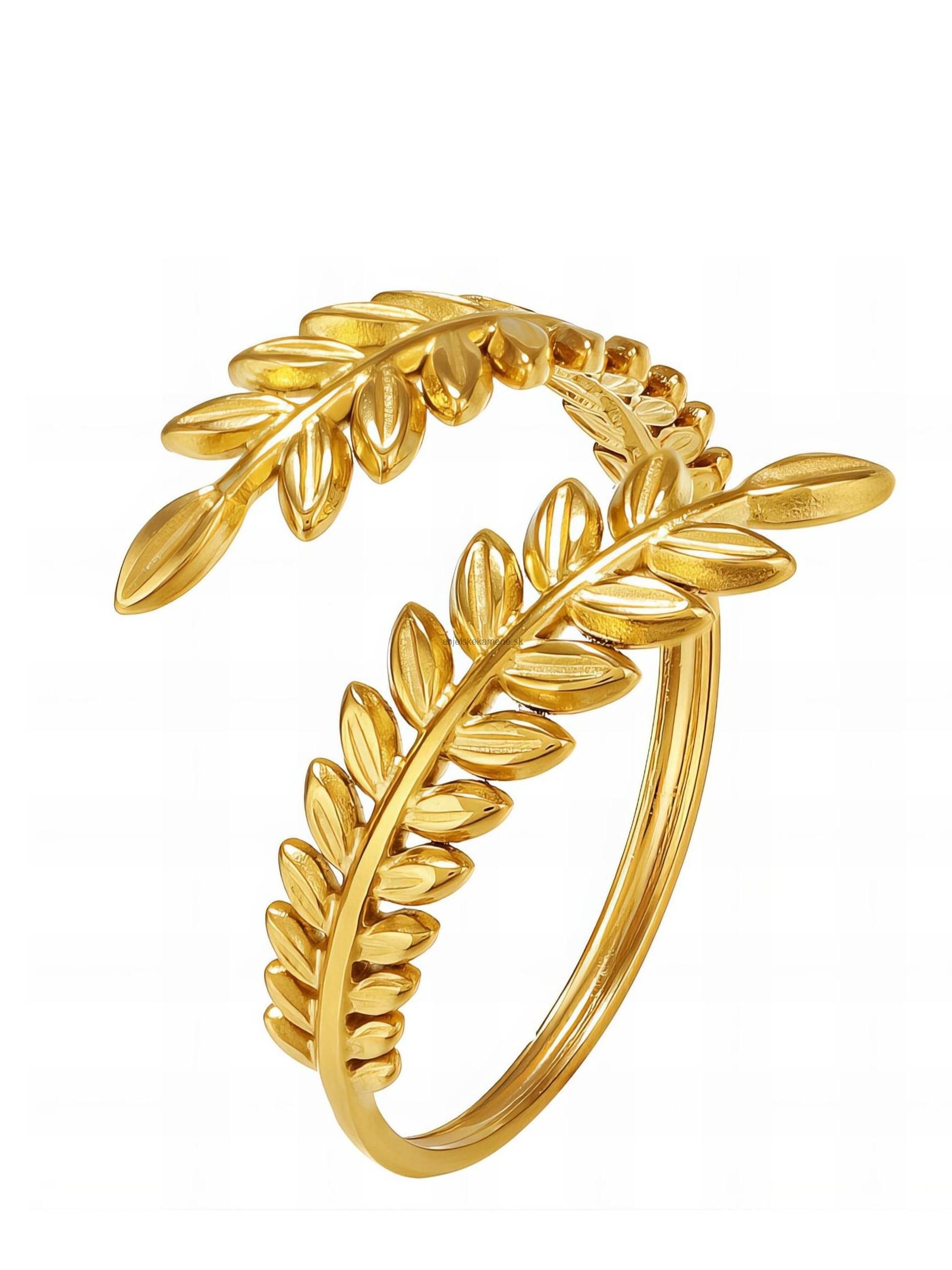 Nastaviteľný prsteň s motívom listu je vodeodolný z nehrdzavejúcej titánovej ocele, pozlátený 18k zlatom.