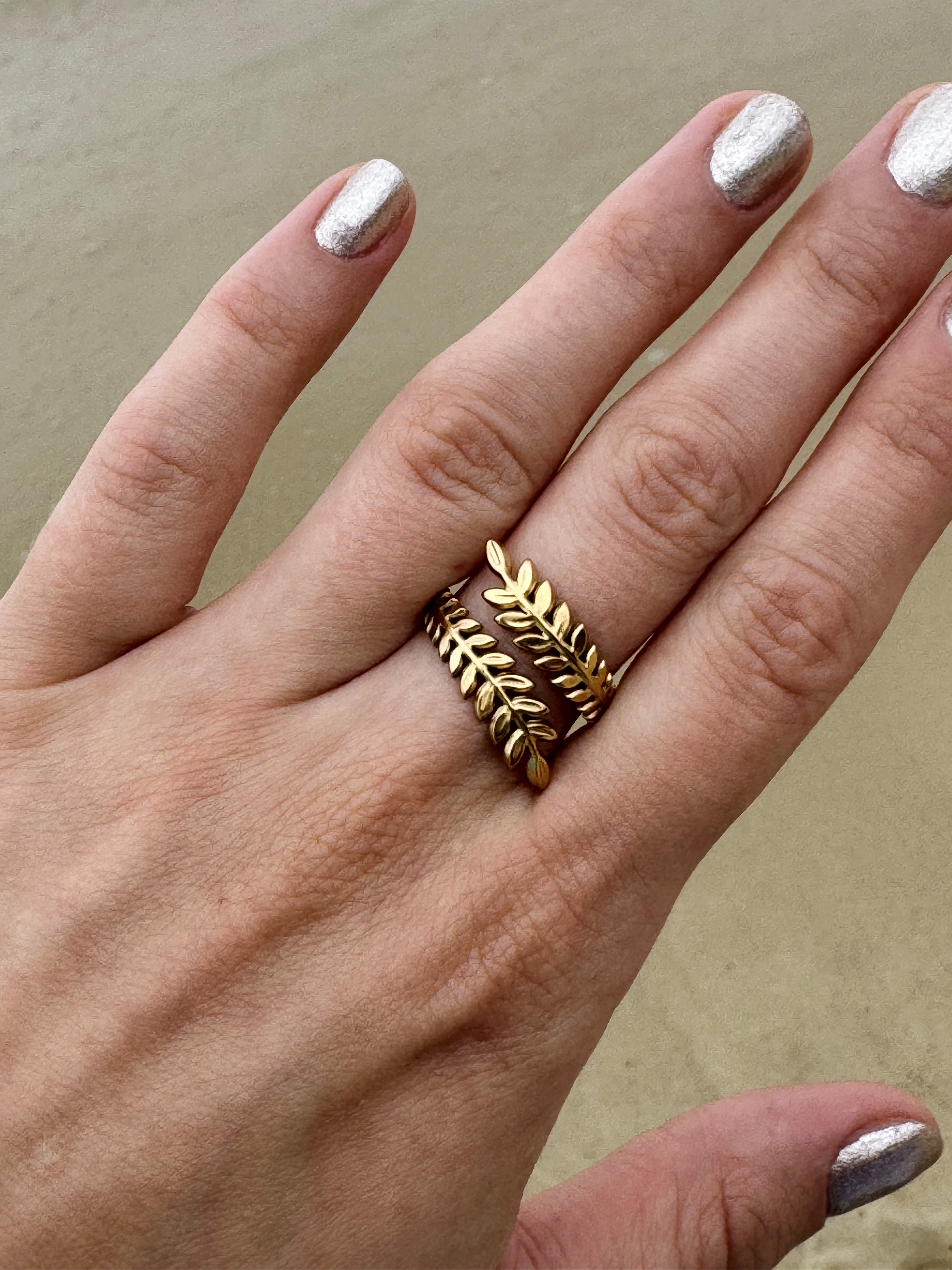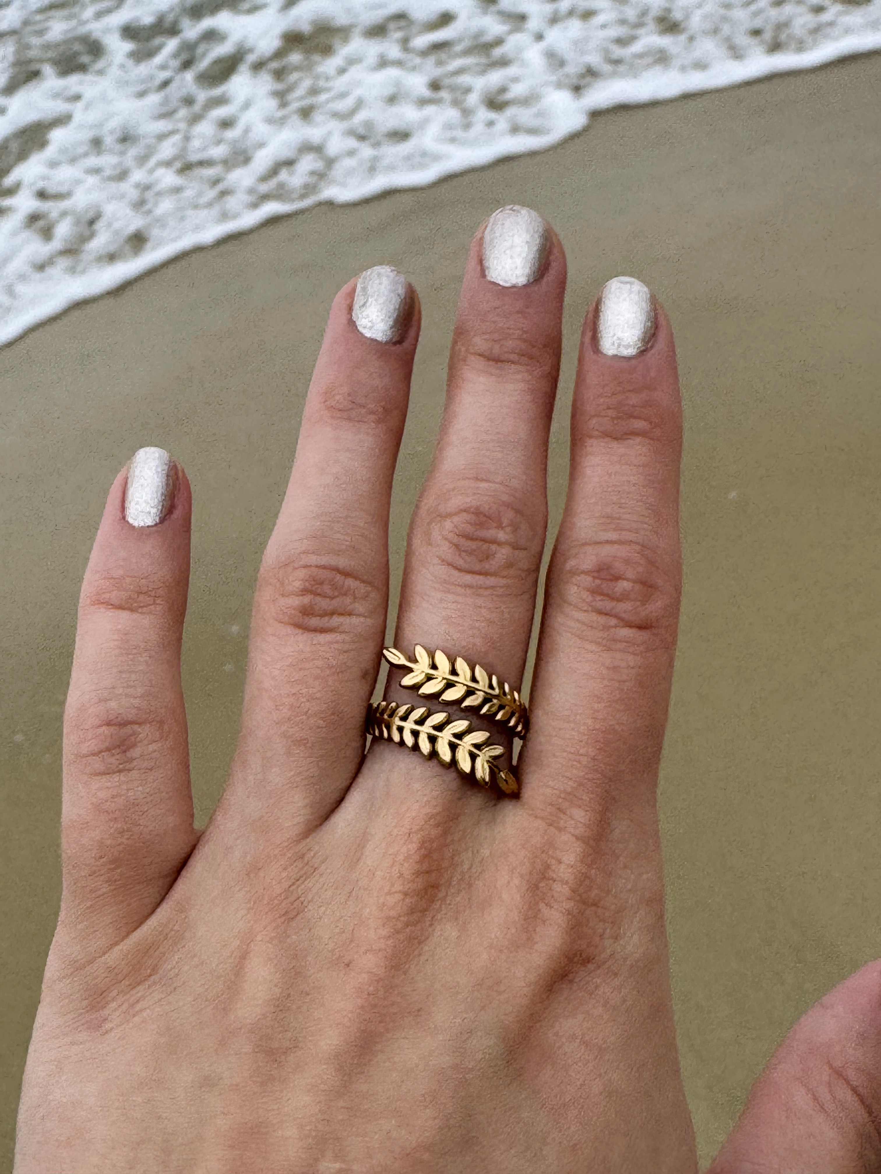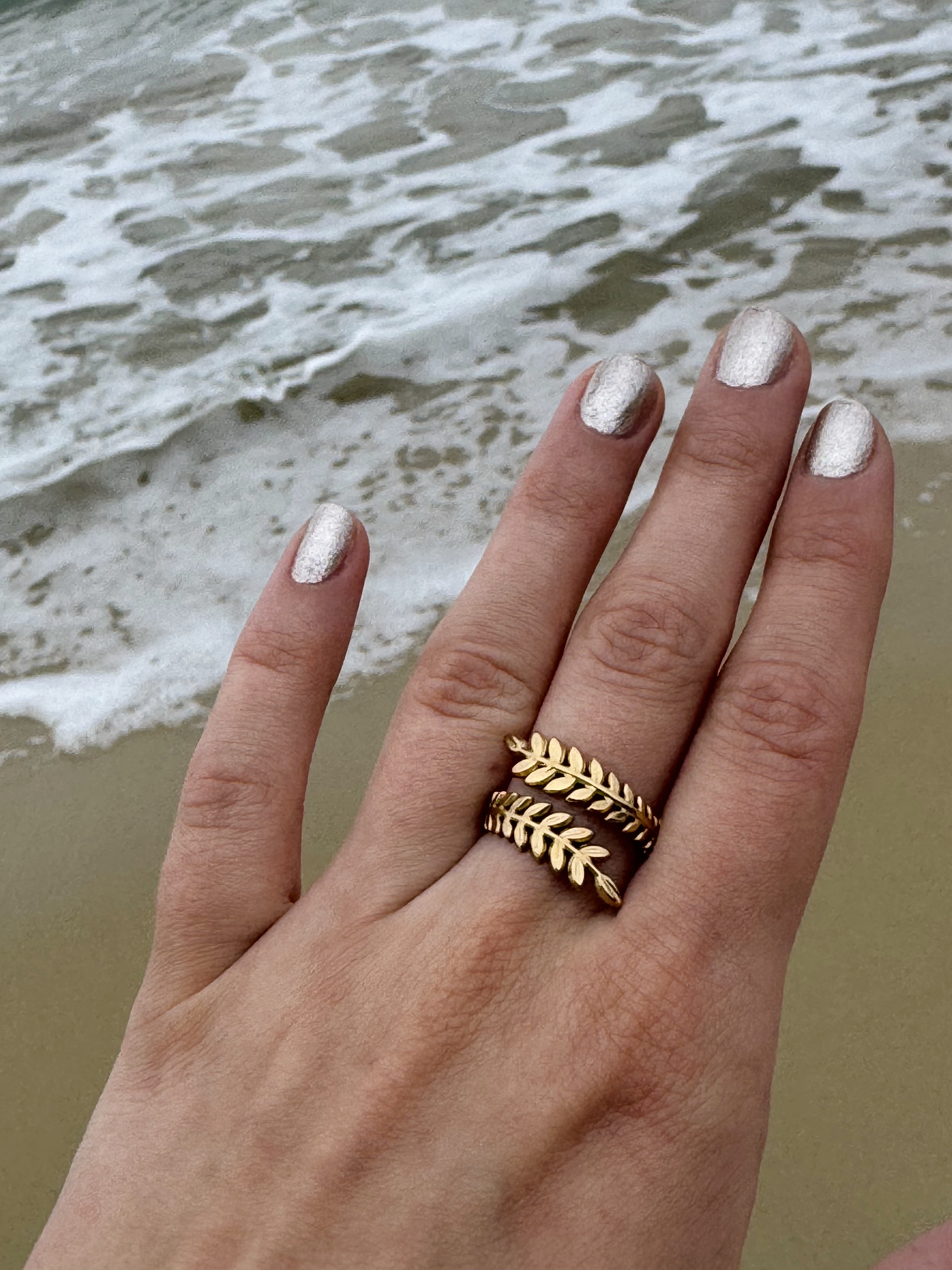 Nastaviteľný prsteň s motívom listu je vodeodolný z nehrdzavejúcej titánovej ocele, pozlátený 18k zlatom.