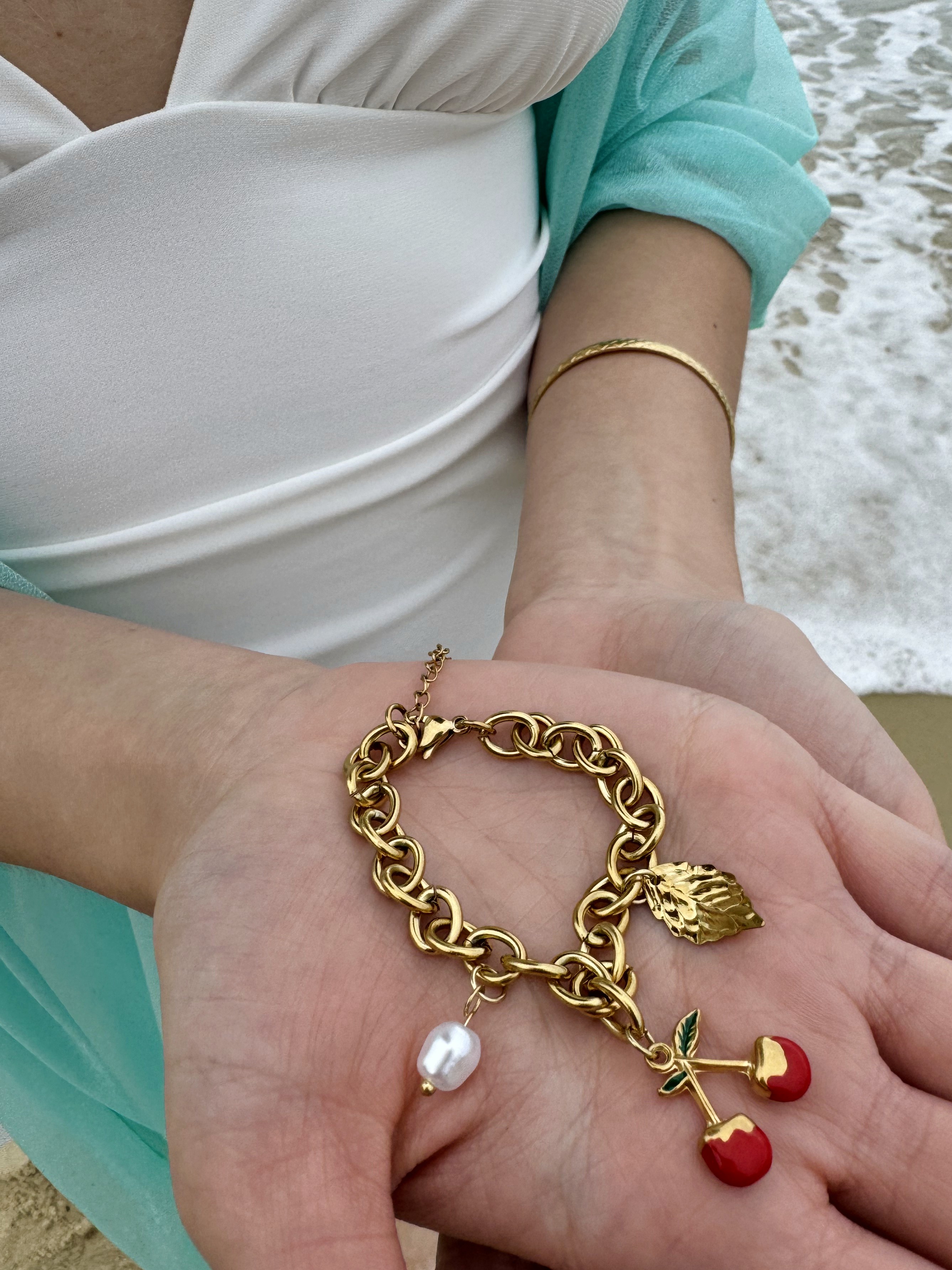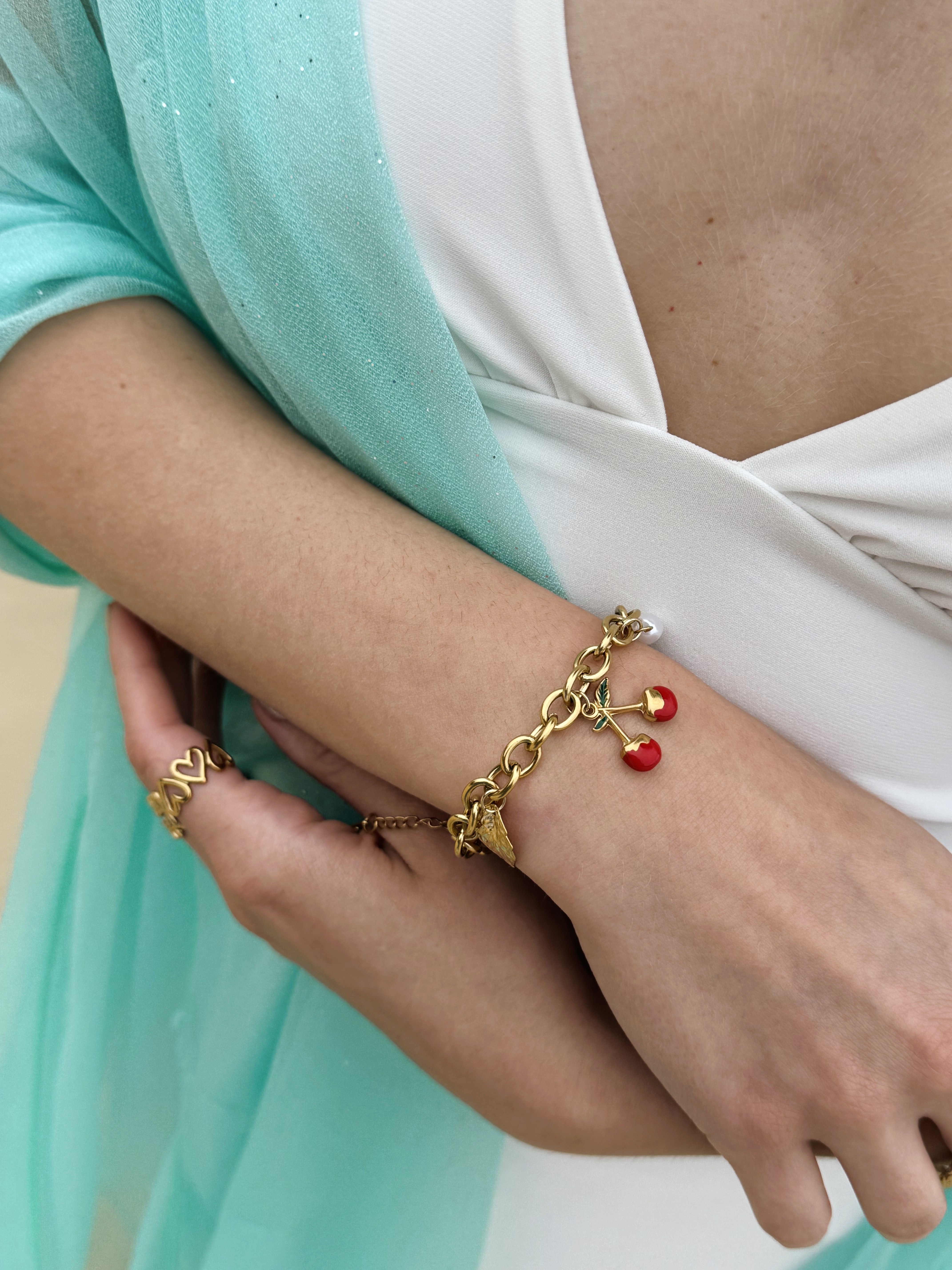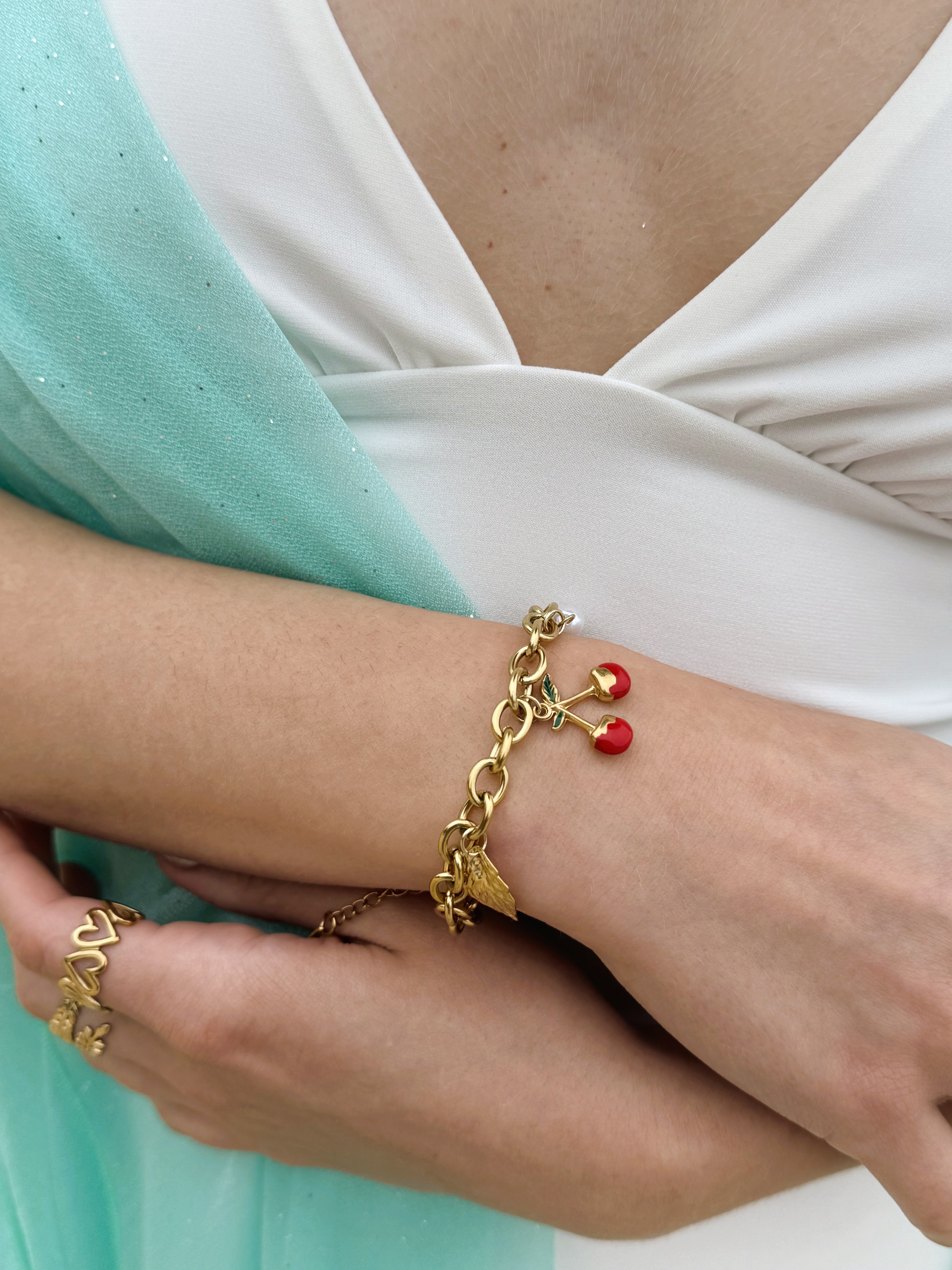 Náramok s príveskami čerešní je vodeodolný z nehrdzavejúcej titánovej ocele, pozlátený 18k zlatom.