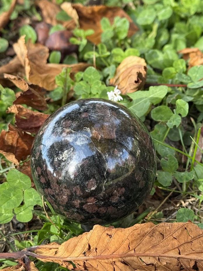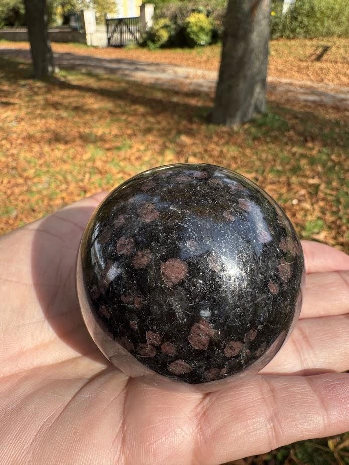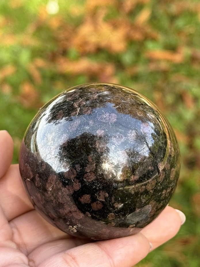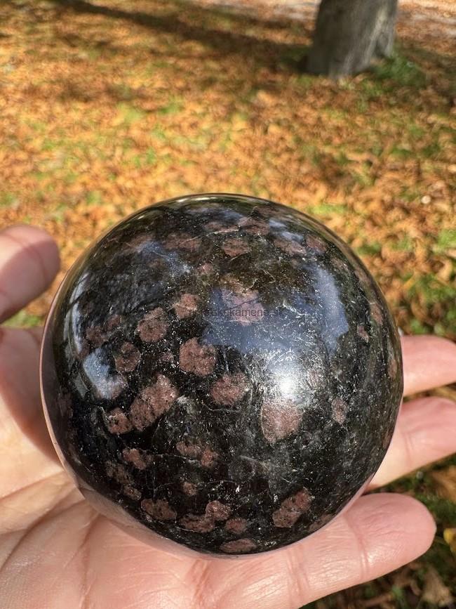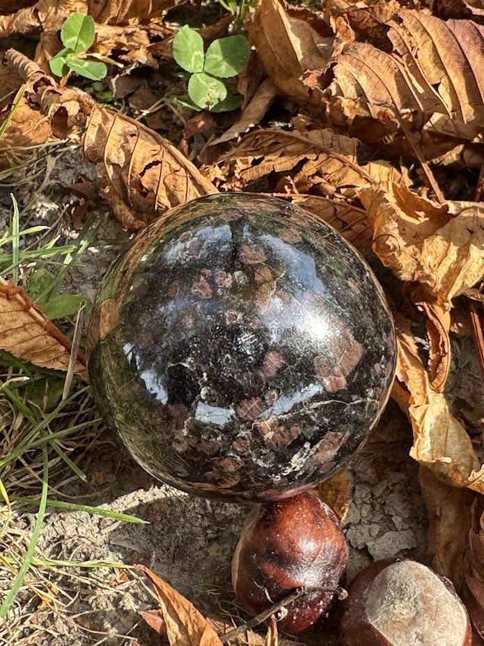 Gula z minerálu granát v kombinácii s čiernym turmalínom vo veľkosti 6,2 cm, váha 386 g.