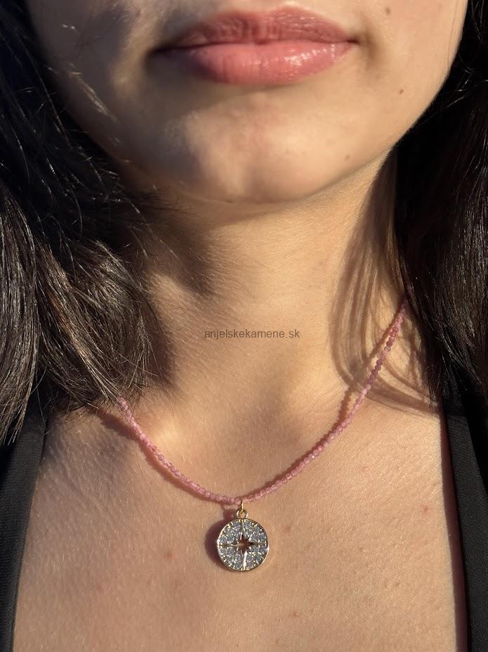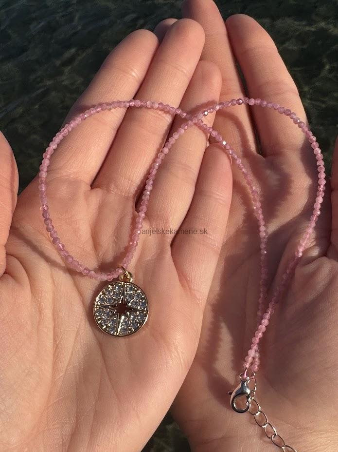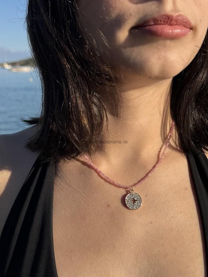 Krátky náhrdelník z fazetovaného rubelitu veľkosť 2 -3 mm. Prívesok so zirkónmi je pozlátený 24k zlatom. Odporúčame zakúpiť nastaviteľný náramok. Krátky náhrdelník môžete nosiť samostatne, alebo ho vrstviť. Elegantný šperk, ktorý pristane každej žene, bez rozdielu veku.