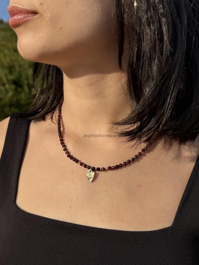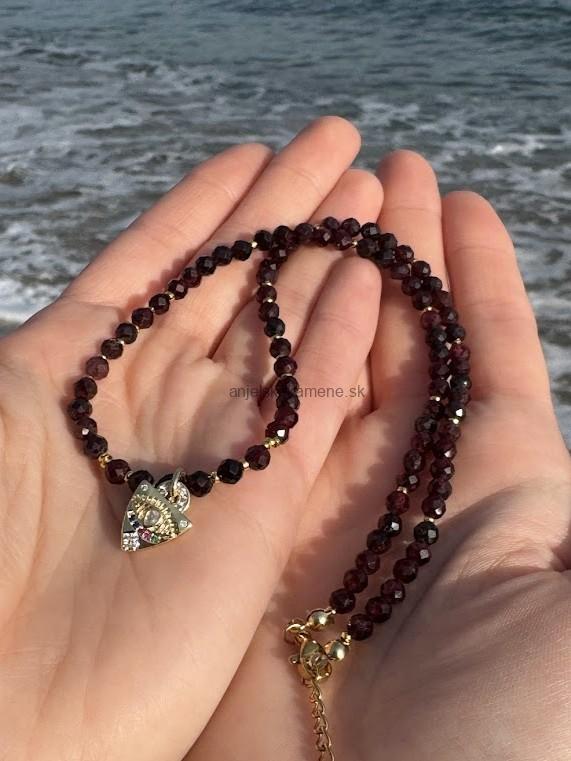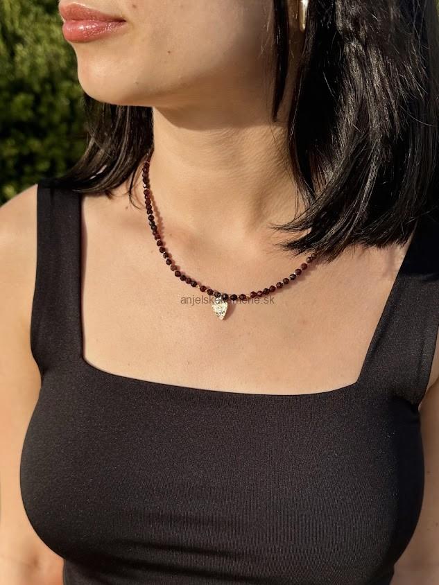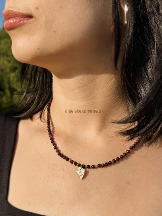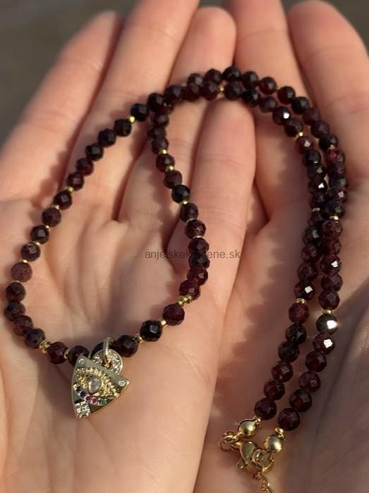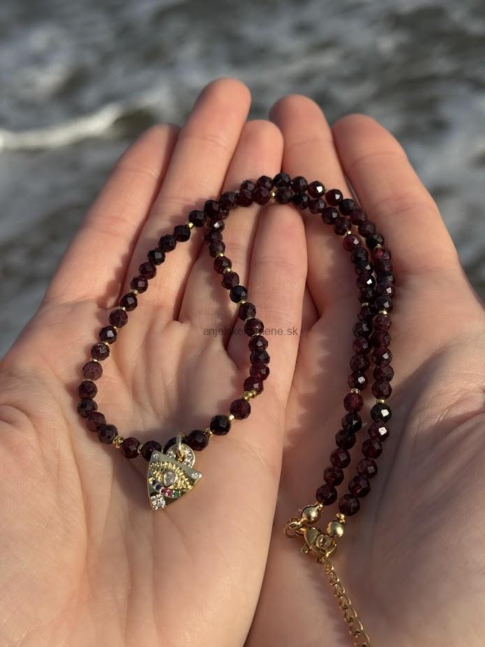 Vášnivý plameň je krátky náhrdelník z fazetovaného z minerálu granát. Prekrásny lesk. Jemný, ale neprehliadnuteľný šperk. Prívesok je pozlátený 14k zlatom. Kupujete si originálny kúsok, ktorý je vyrobený iba jeden na svete.