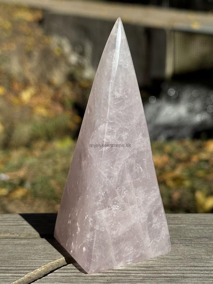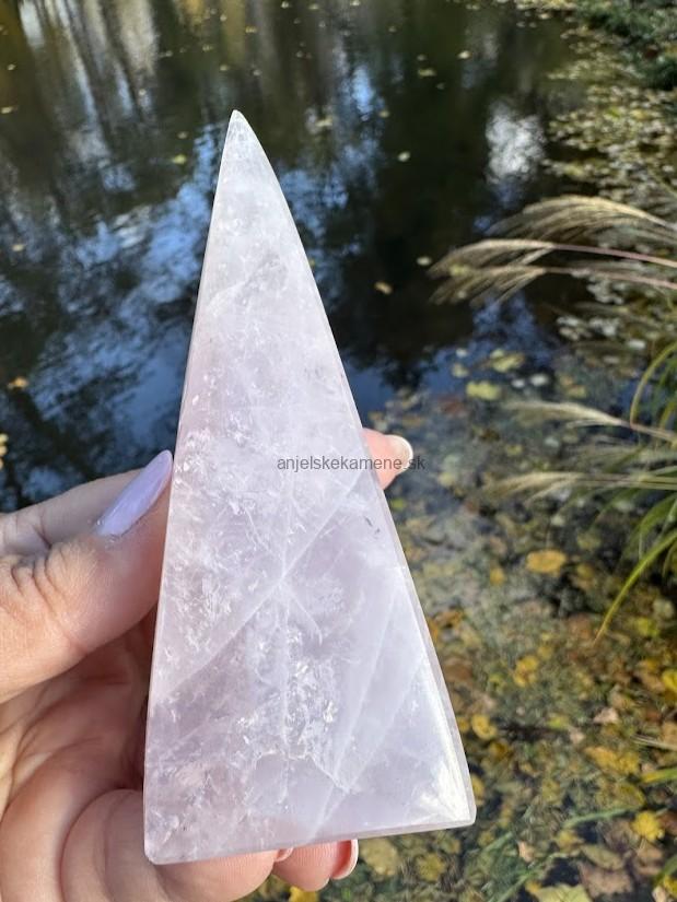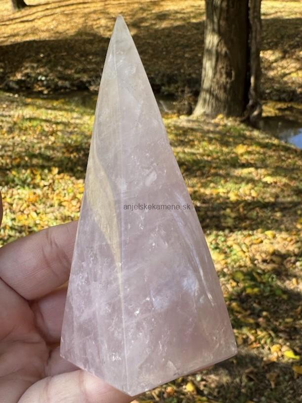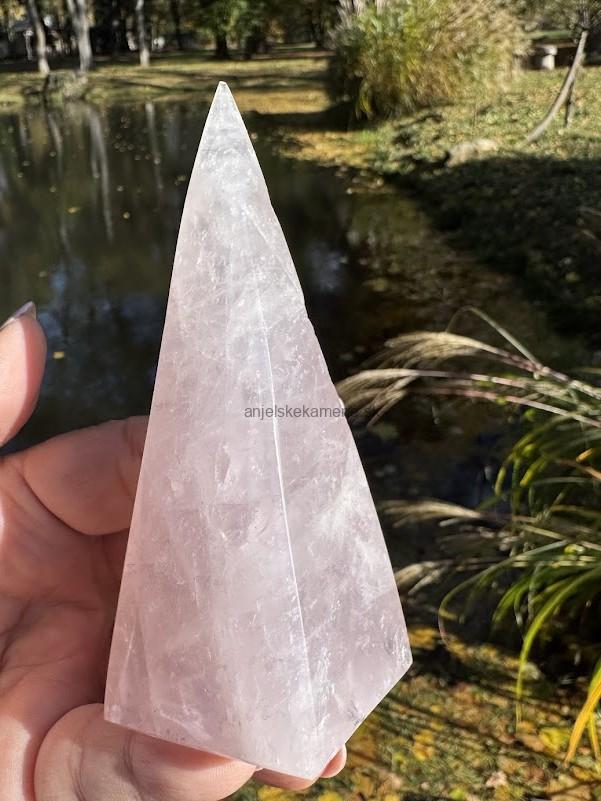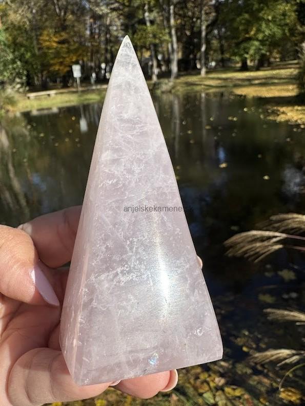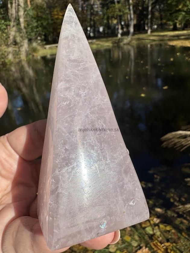 Pyramída z minerálu ruženín vo veľkosti 11,7 x 4,4 cm. Má drobné dúhy. Pôvod Madagaskar.