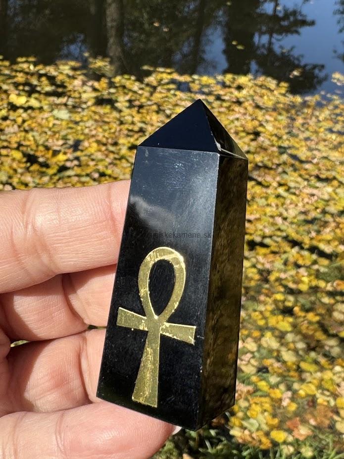 Obsidián v tvare generátora, zlatý ANKH, pôvod Mexiko.