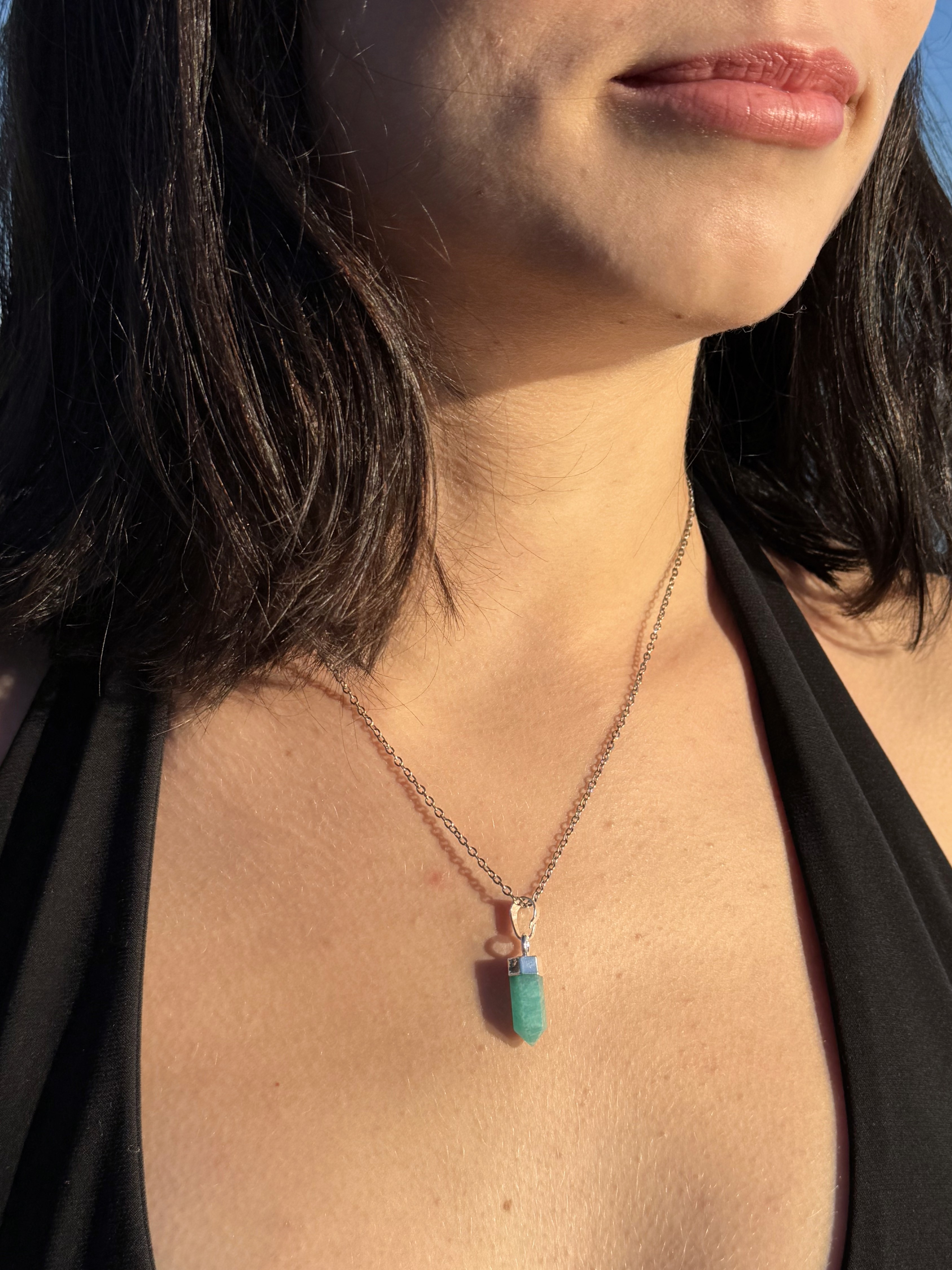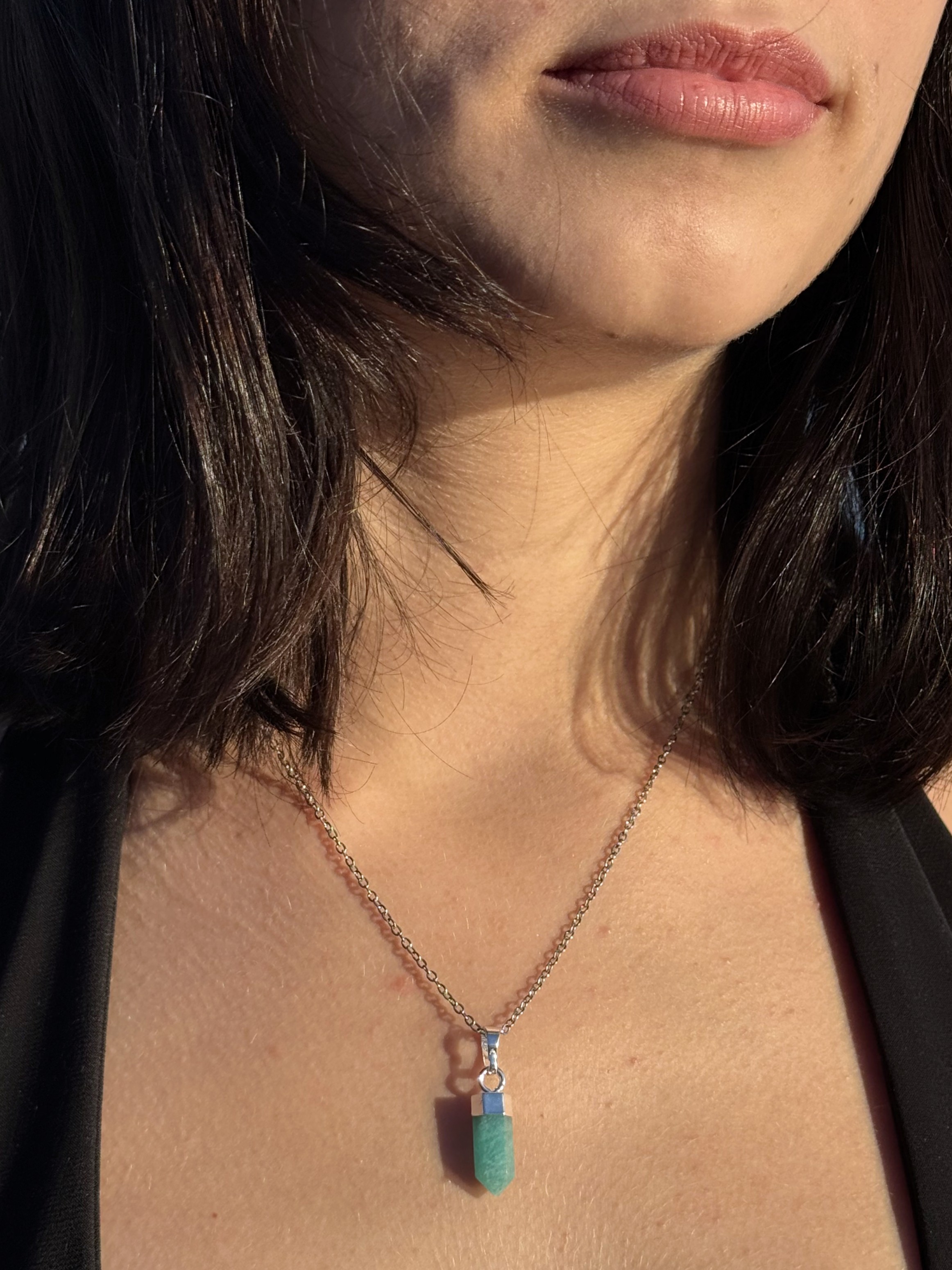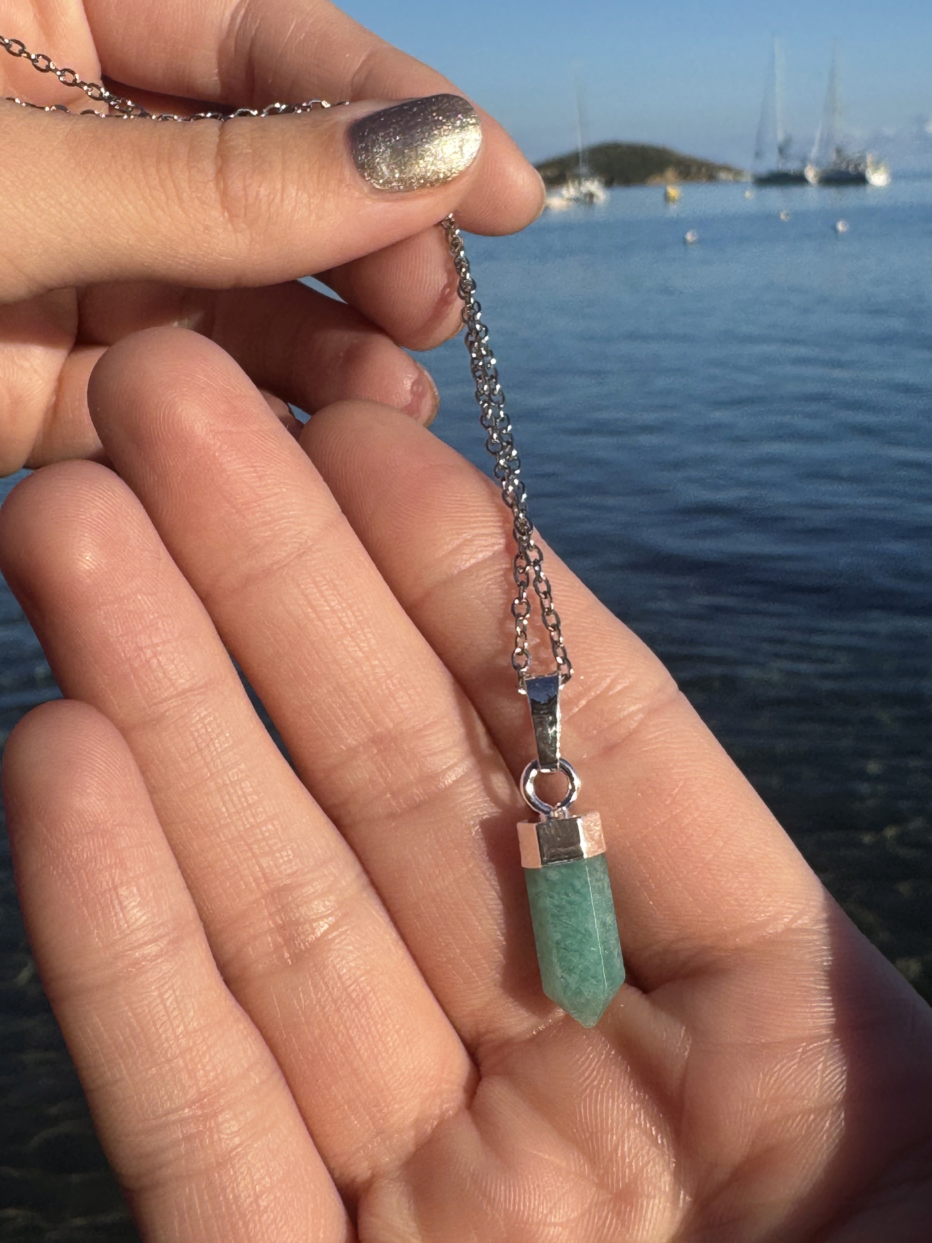 Mini generátor z amazonitu v prekrasnej farbe, uchytenie je potiahnuté striebrom. Pokiaľ hrot amaonitu smeruje dole, zamieri lúč duchovnej ríše do vášho telesného sveta, čo je poloha vhodná pre liečenie.