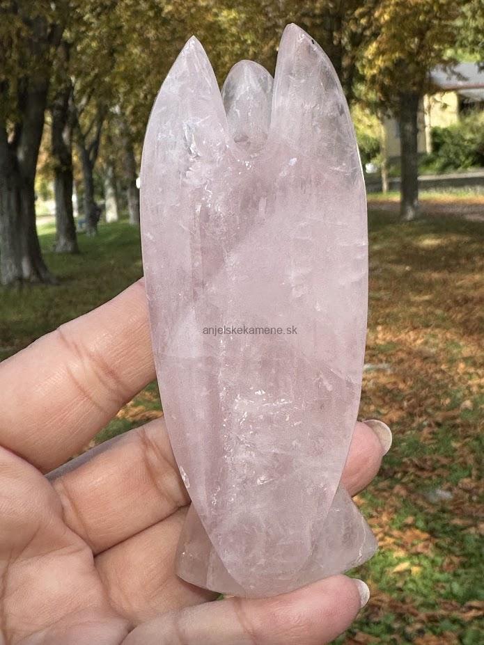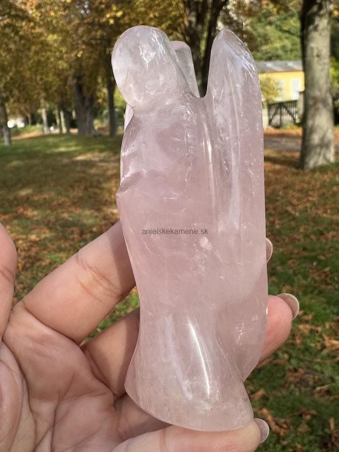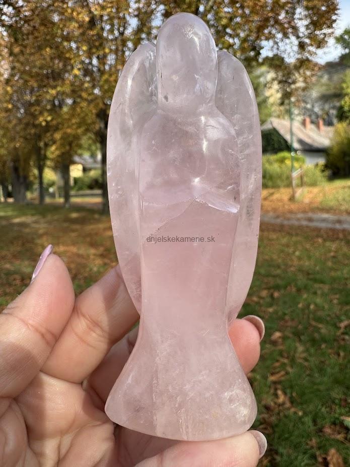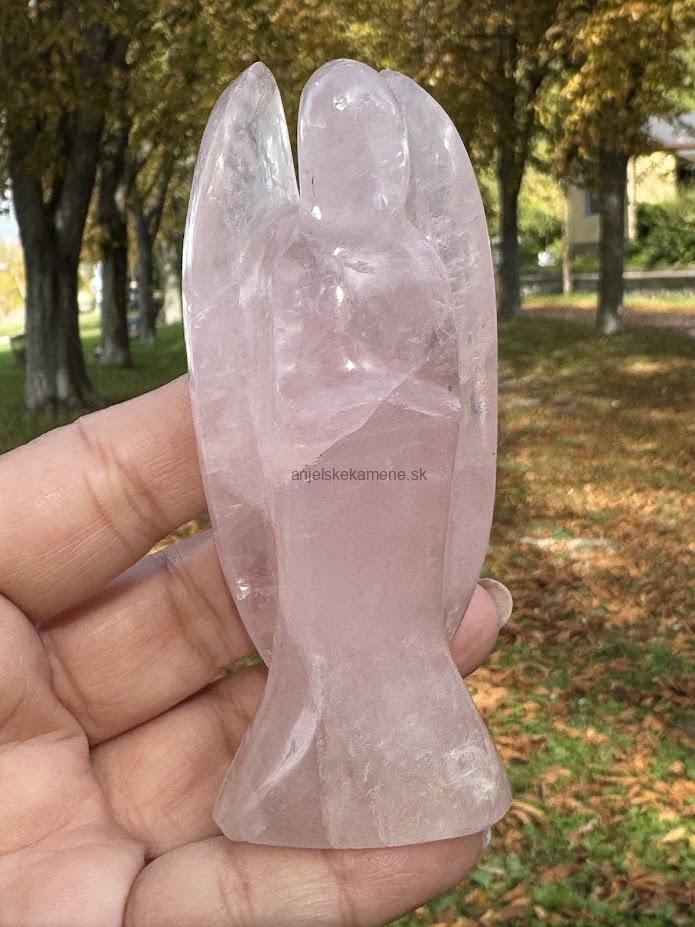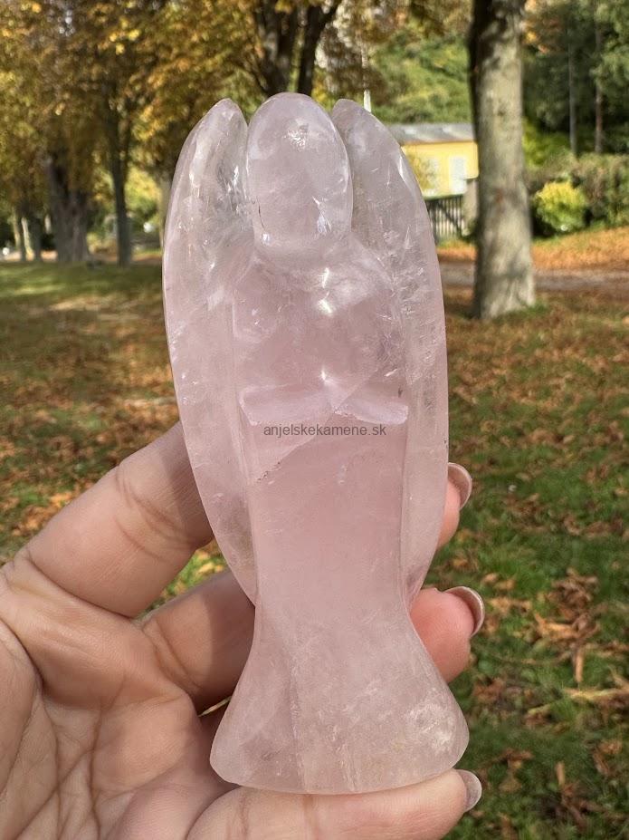 Anjel z minerálu ruženín s dúhami. Krásna nežná ružová farba. Symbol anjela pripomína, že tu nie ste sami a tak ho odporúčame nosiť pri sebe, alebo umiestniť blízko postele.