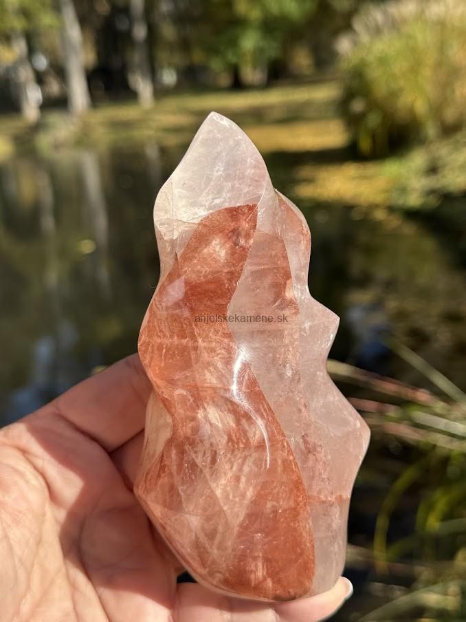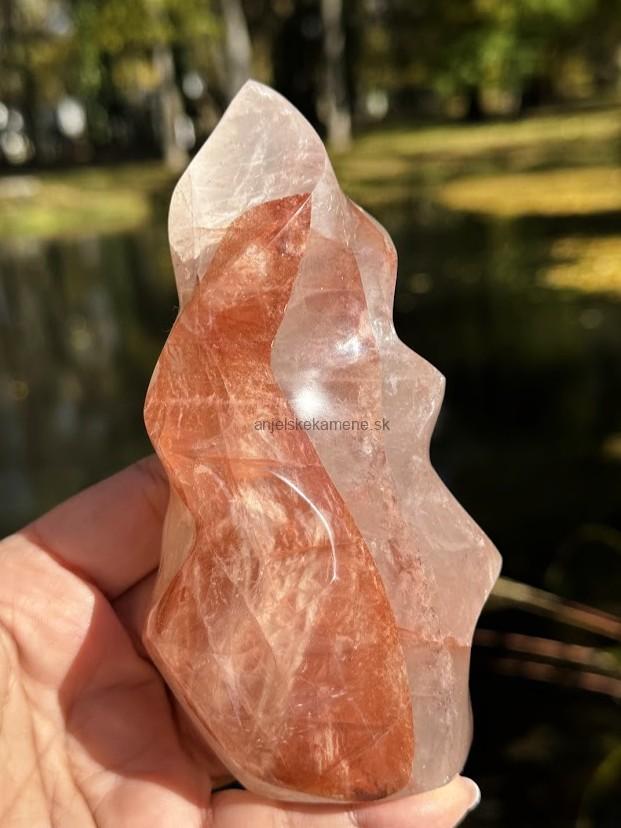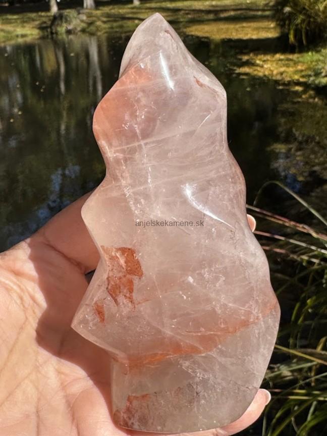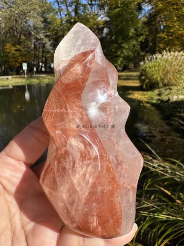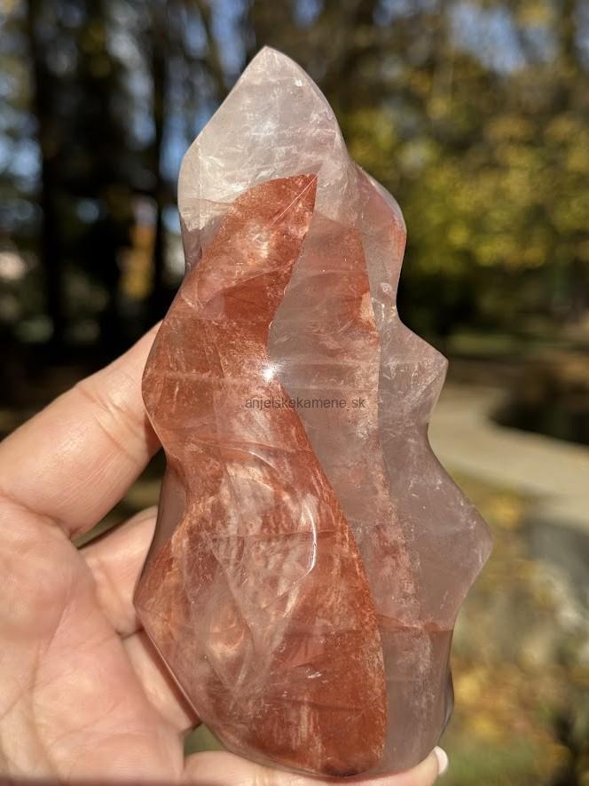 Hematoid opracovaný do tvaru plameňa, Je úplne prirodzené, že práve tento kryštál je opracovaný do tvaru plameňa, pretože sa mu hovorí aj ohnivý kremeň. Veľkosť 13,5 x 7,5 cm, 533 g. Pôvod Madagaskar.