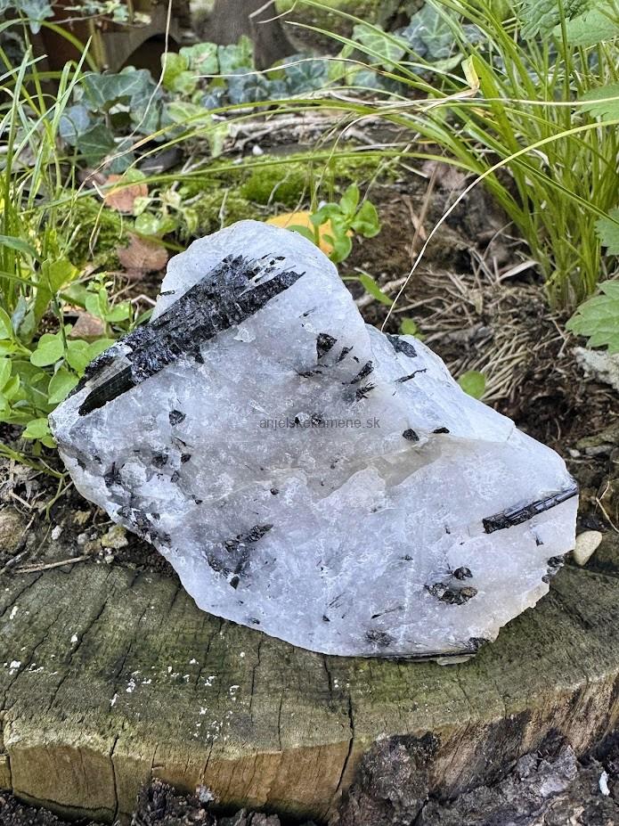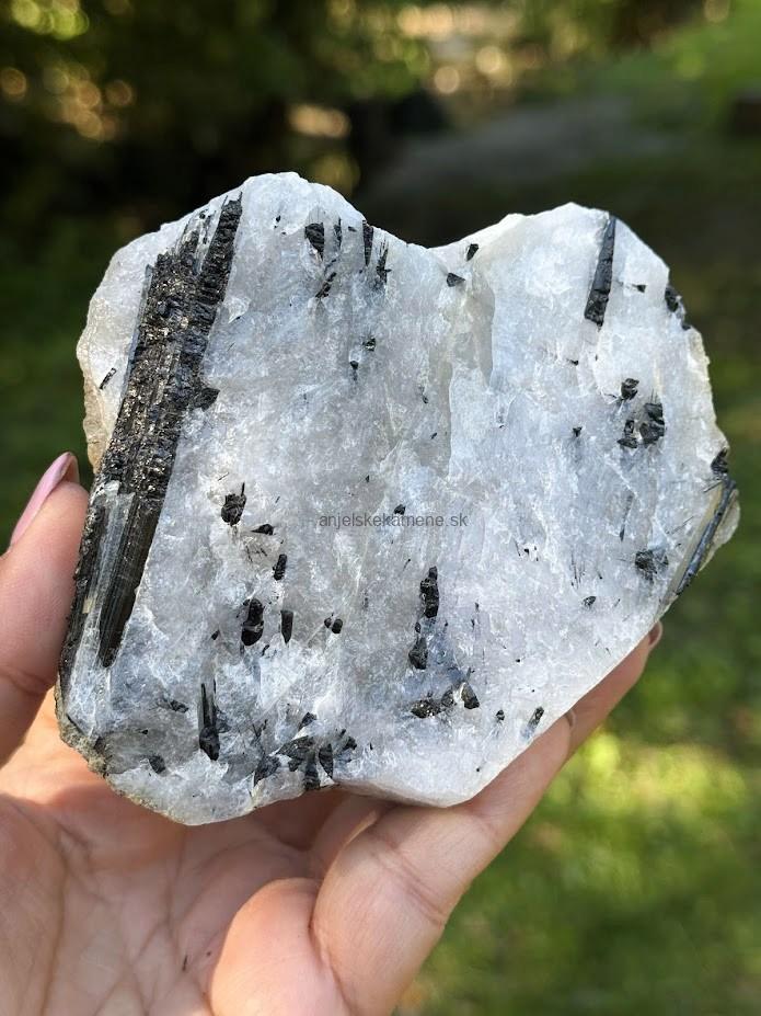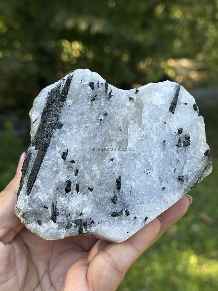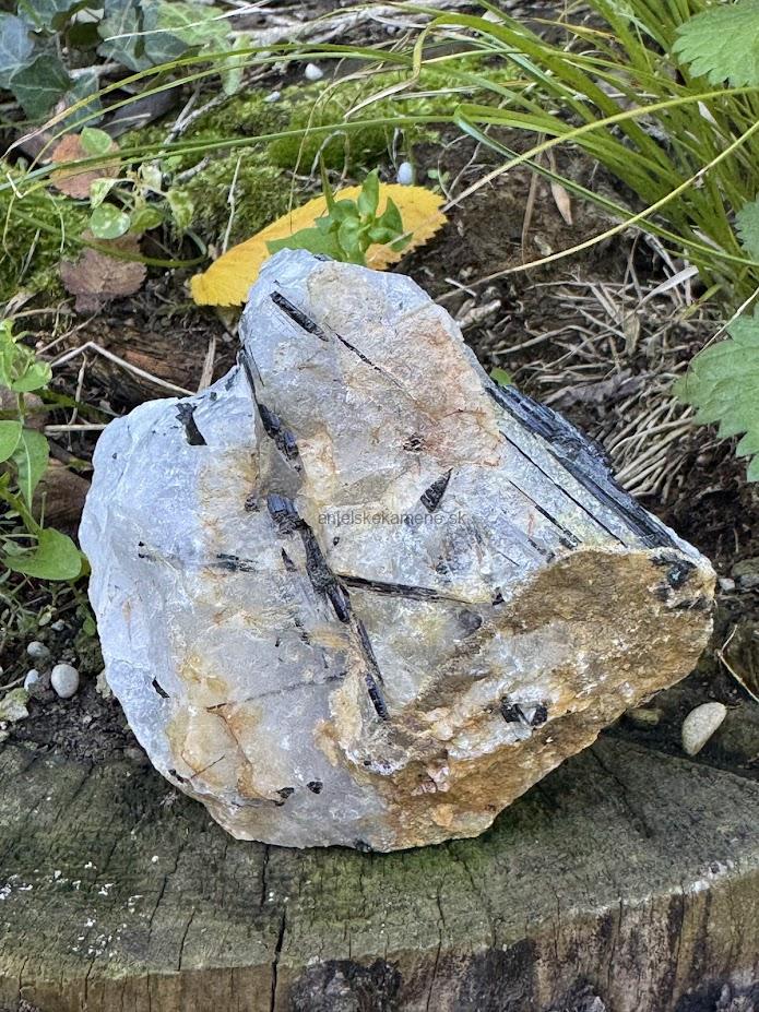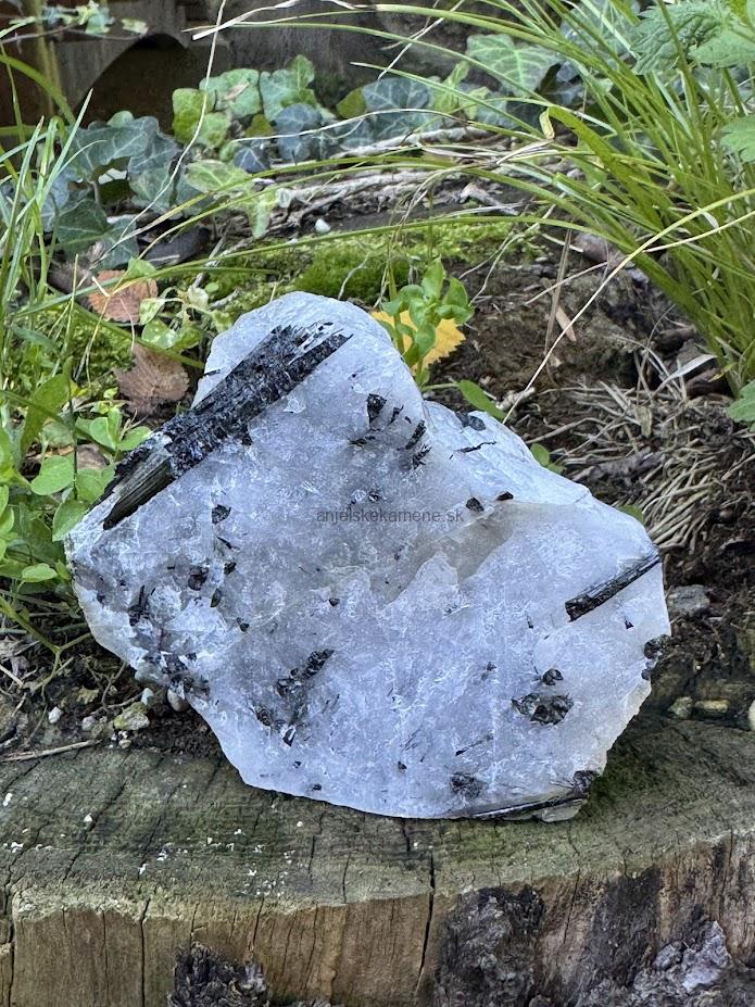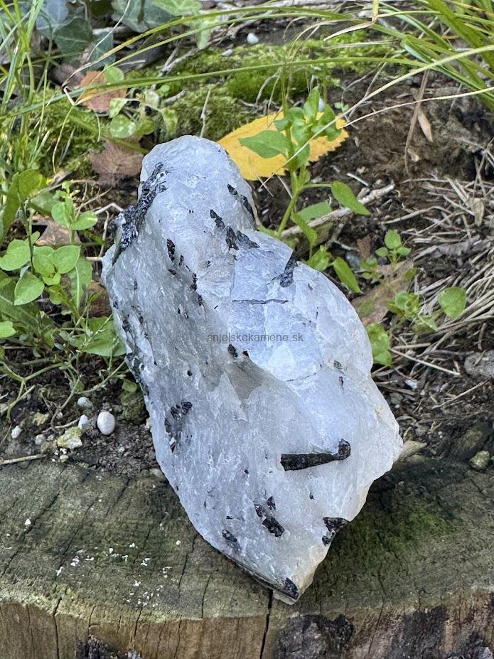 Surový minerál krištáľ s turmalínom. Váha 509 g, najdlhšia strana má 11,8 cm.
