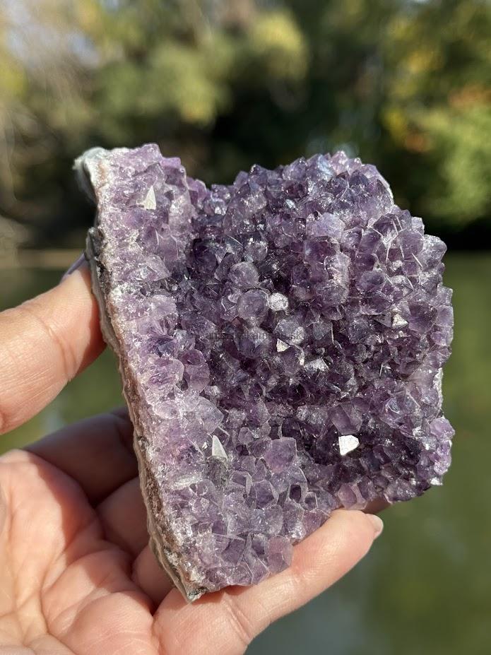 • Ametyst je predovšetkým kameň duchovnej čistoty a meditácie. Prepája dušu s duchovným svetom. Jeho vyžarovanie je harmonické a uvádza do rovnováhy myseľ a cit. Je symbolom premeny. Otvára nám tajomstvá, ktorým by sme neporozumely použitím samotného rozumu. Pomáha nám k uskutočneniu našich vízií a prináša svetlo do našich snov. V prítomnosti ametystu si vieme jednoduchšie predstaviť našu budúcnosť, vidíme súvislosti s minulosťou a chápeme príčinu a následok. Je to kameň inšpirácie. Obohacuje našu meditáciu. Podporuje v nás lásku, nezištnosť, obetavosť a túžbu pomáhať druhým. Ametyst je základným liečiteľským kameňom, je to kameň ochranca, bráni pred psychickými útokmi, očisťuje telo i myseľ. Usporadúva myšlienky a prináša poznanie, čo je pre nás skutočne dôležité. Zlepšuje pamäť, pomáha k dosiahnutiu vytýčených cieľov v pokoji a bez stresu.  V noci si dajte ametyst pod vankúš pre pokojný spánok a príjemné sny. Tento kamienok pomáha deťom zbaviť sa strachu z tmy. Predstavuje psychickú obranu proti nepríjemným ľuďom, pomáha pri citových bolestiach.