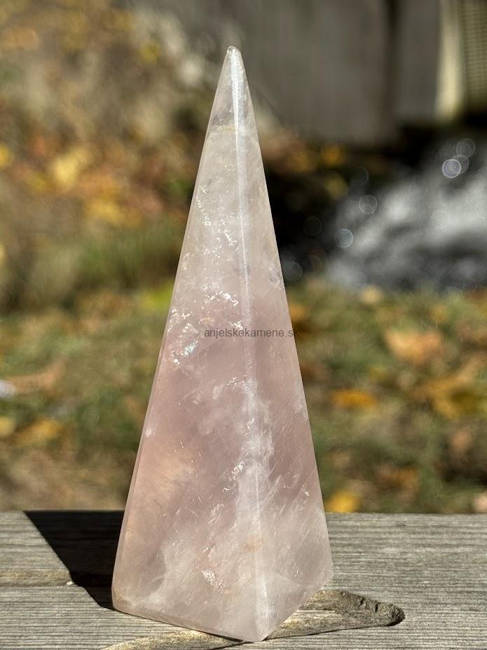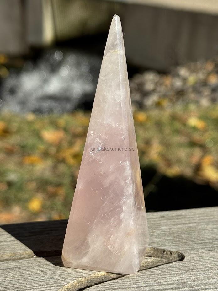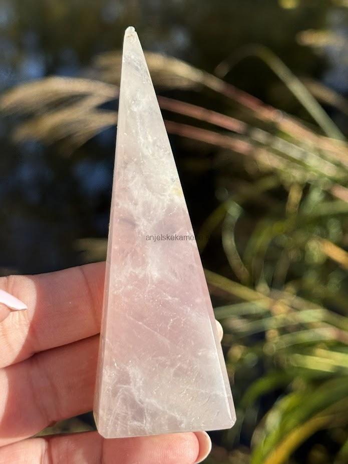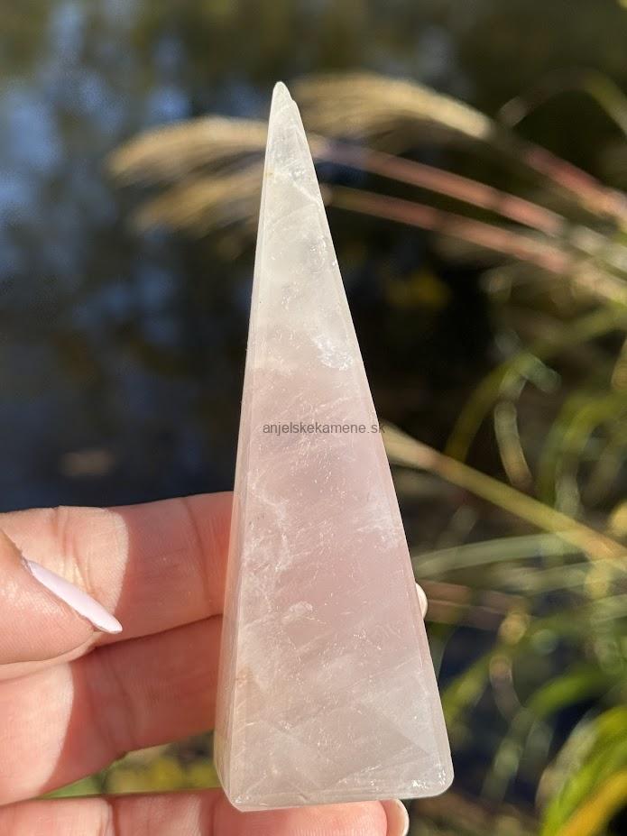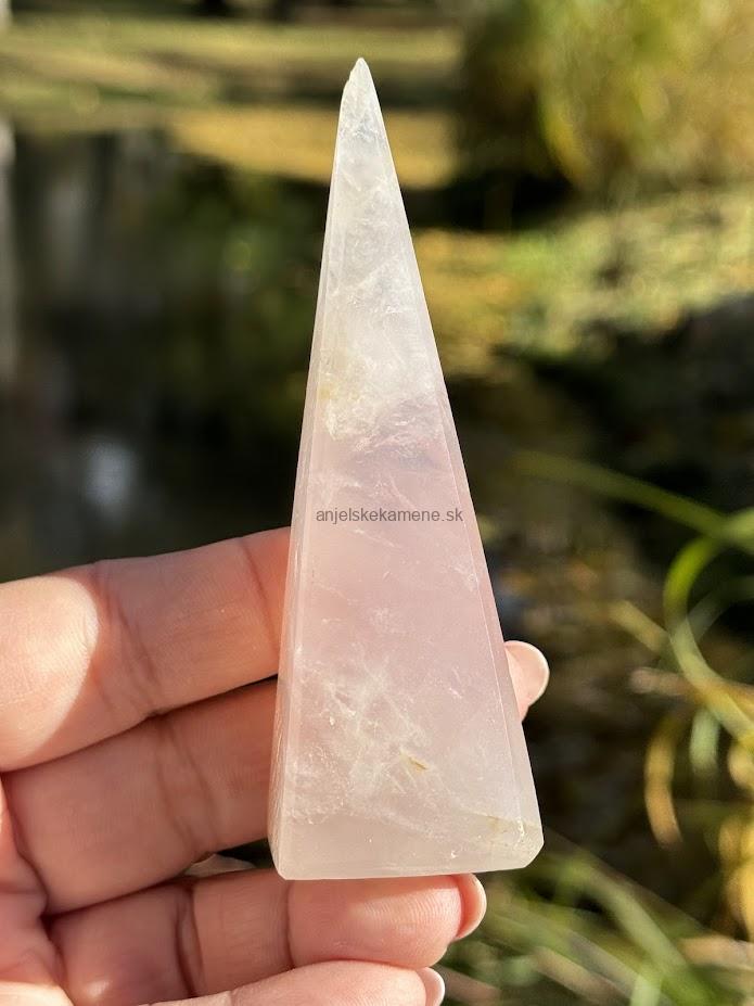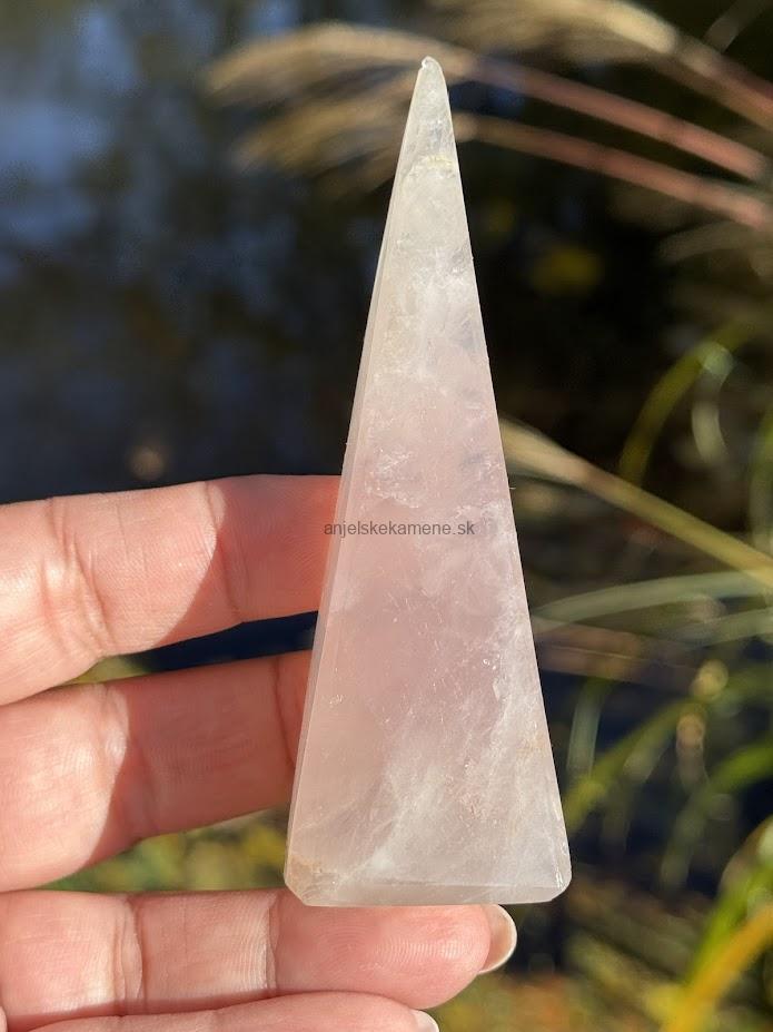 Pyramída z minerálu ruženín vo veľkosti 9,9 x 3,2 cm. Má drobné dúhy. Pôvod Madagaskar.