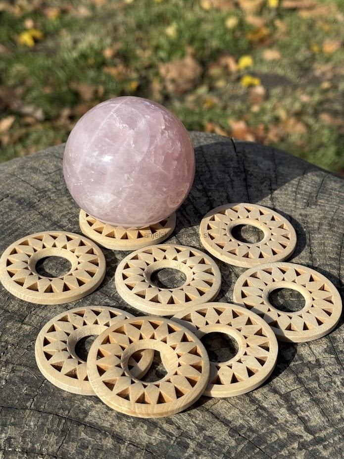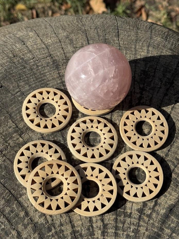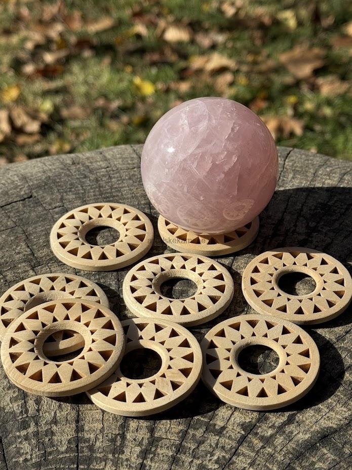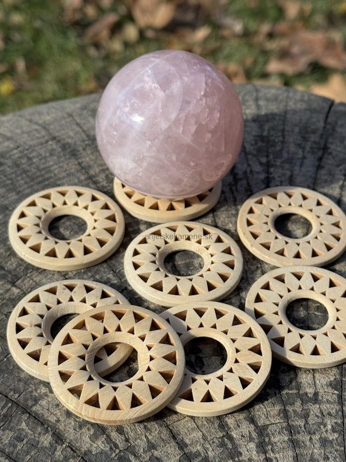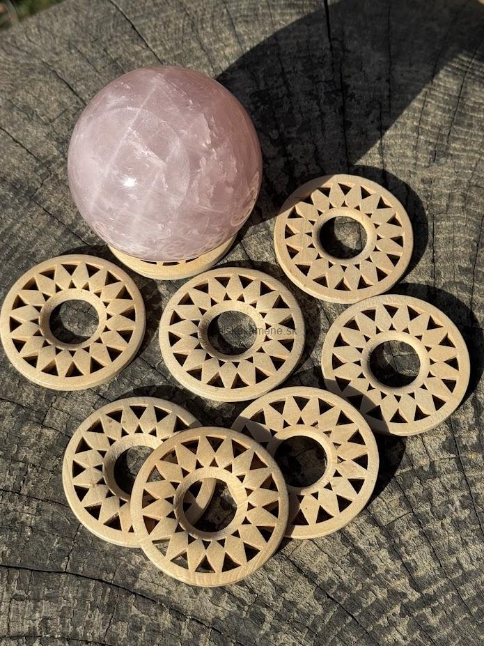 Drevený stojan pod gule z minerálov. Tvar stojana je prispôsobený na rôzne veľkosti gúľ.