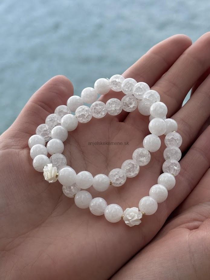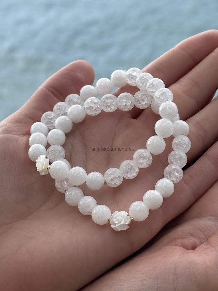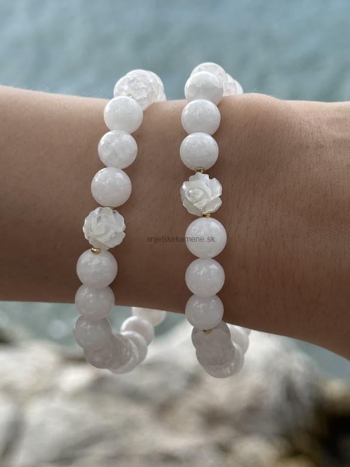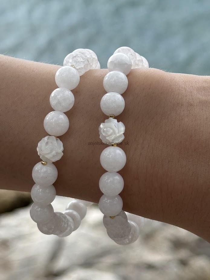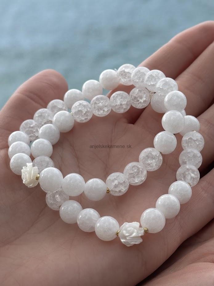Biela ruža je náramok z minerálu jadeit biely a pukaný krištáľ doplnený vyrezávanou ružou z perlete.